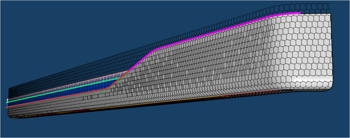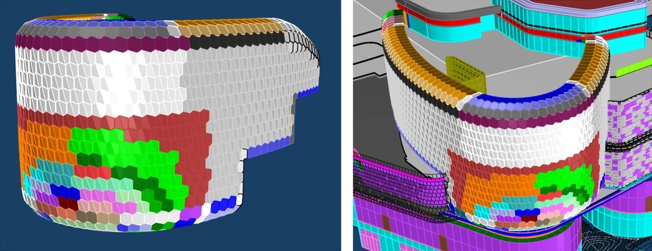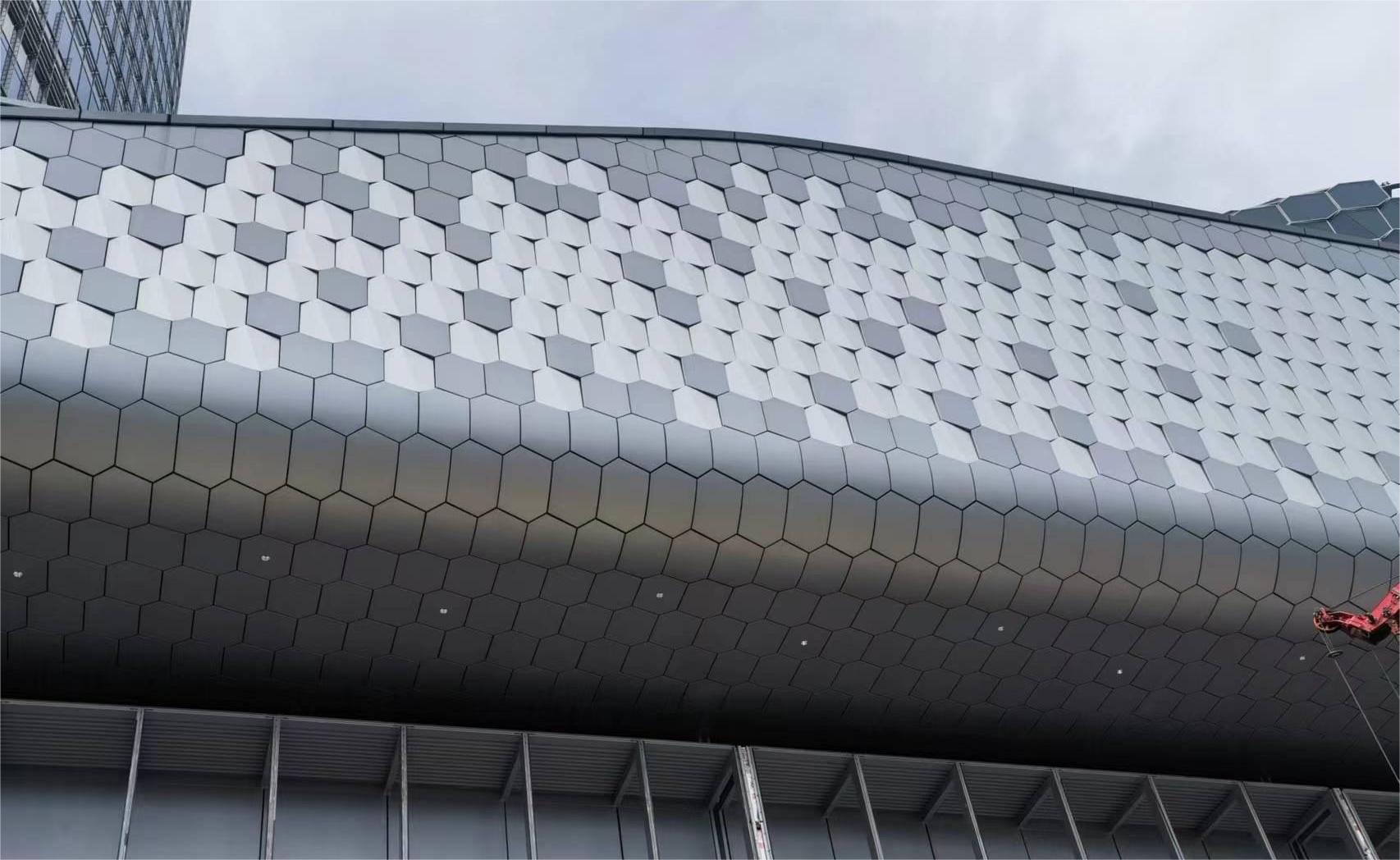 南裙樓船頭造型內部鋼結構均有扭轉,要求拐角幕墻呈現(xiàn)雙曲面效果;屋檐幕墻設計圍繞龍鱗造型,分解為單片“六邊形”元素展開,拐角弧度造型對鋁板制造及安裝工藝要求極高。